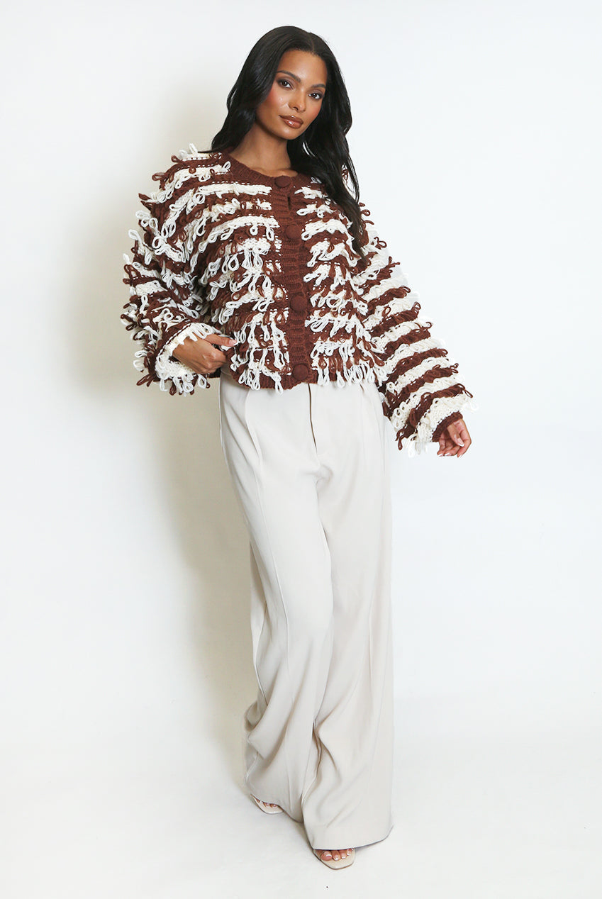 Elevate your wardrobe with the Contrast Loop Knit Cardigan, featuring luxurious suede fabric for a soft, stylish feel. The front zip closure offers easy wear and a sleek finish, while the wide long sleeves add a contemporary flair and extra comfort. Perfect for layering, this cardigan blends unique textures with practical design to keep you effortlessly chic throughout the day.